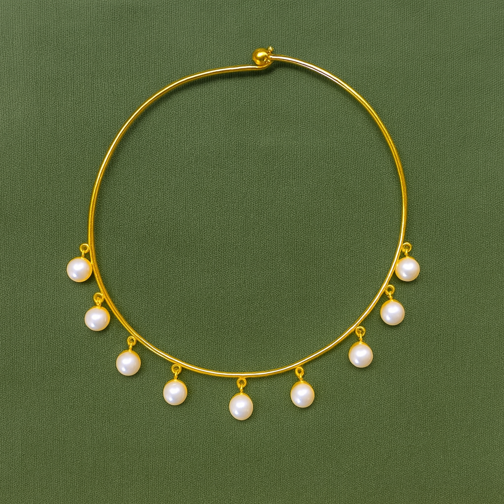 Grace your neckline with the Pearlette Hasli — a minimal golden hasli accented with dainty dangling pearls. Its sleek design blends timeless tradition with modern charm, making it an effortlessly elegant choice for festive wear or refined daily styling.