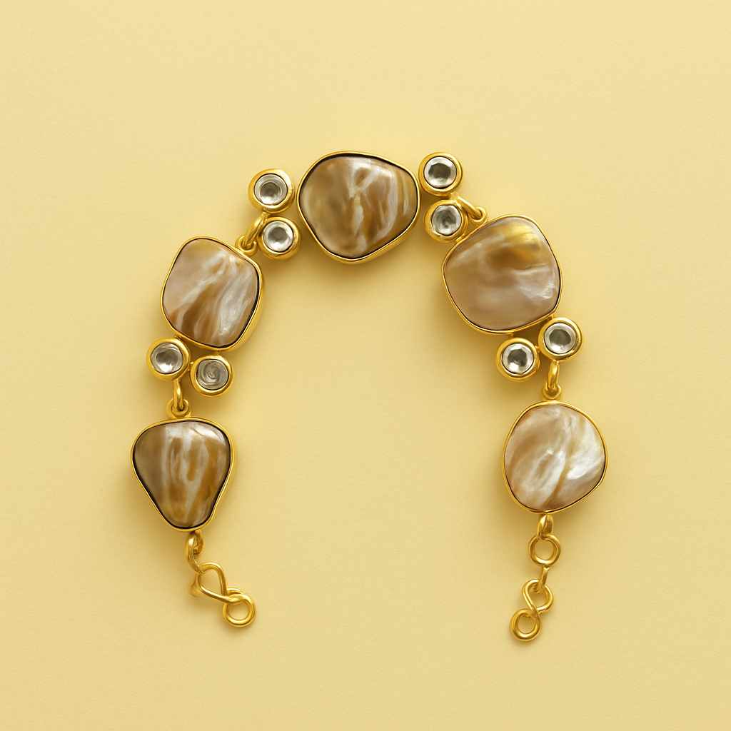 Crafted with the natural beauty of Mother of Pearl stones, this bracelet exudes a subtle iridescence that catches the light with every movement. Known for its calming energy and timeless appeal, the Mother of Pearl makes this piece perfect for elevating both everyday looks and festive occasions.