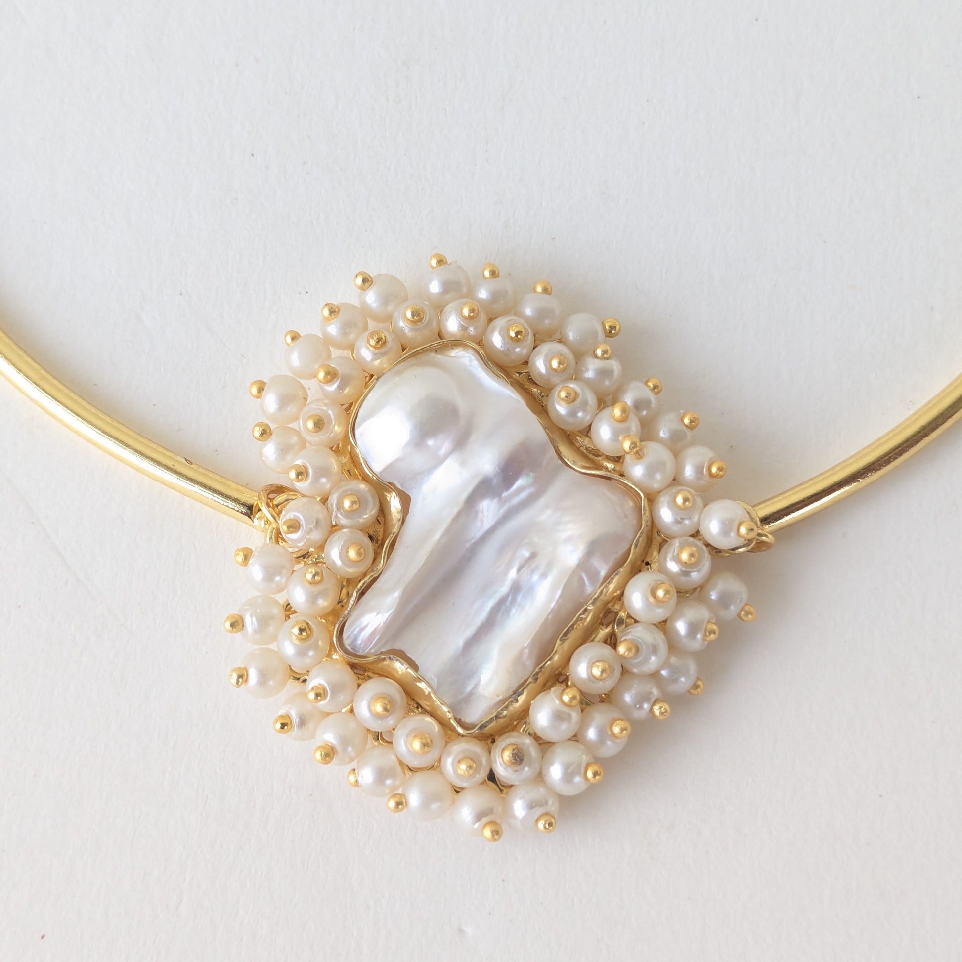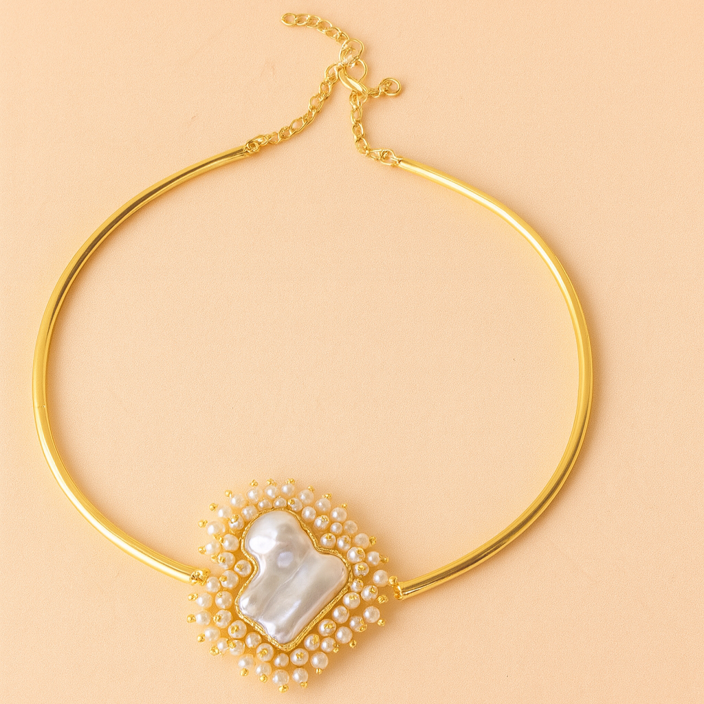 Elevate your style with our exquisite Mother of Pearl Hasli Necklace. Designed in a classic Hasli (rigid collar) style, this statement piece features a luminous Mother of Pearl centerpiece framed with delicate pearls, set on a sleek golden finish. The blend of modern elegance and traditional charm makes it a versatile accessory — perfect for festive occasions, weddings, or adding a touch of luxury to your everyday look.