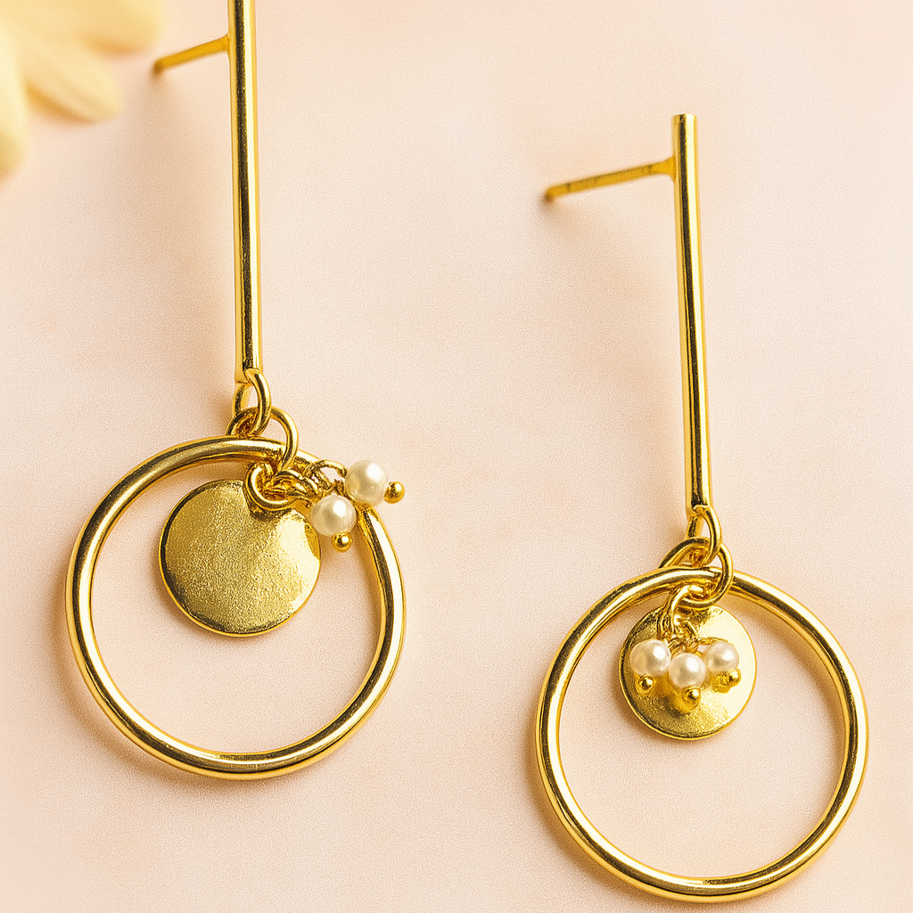 Stylish round studs crafted from brass, adorned with delicate charms and a single pearl for added elegance.