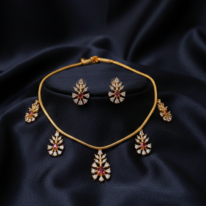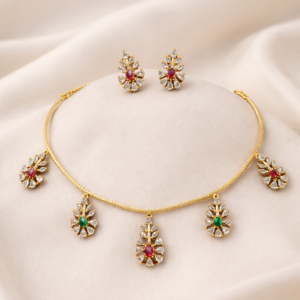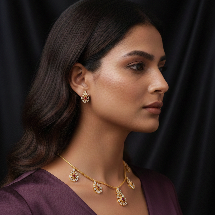 Blush Petal Drop Set features a delicate gold-tone necklace adorned with floral drop motifs and soft blush-pink stones, paired with matching earrings. Designed to add a subtle festive glow, this elegant set is perfect for weddings, celebrations, and special occasions where understated charm stands out.